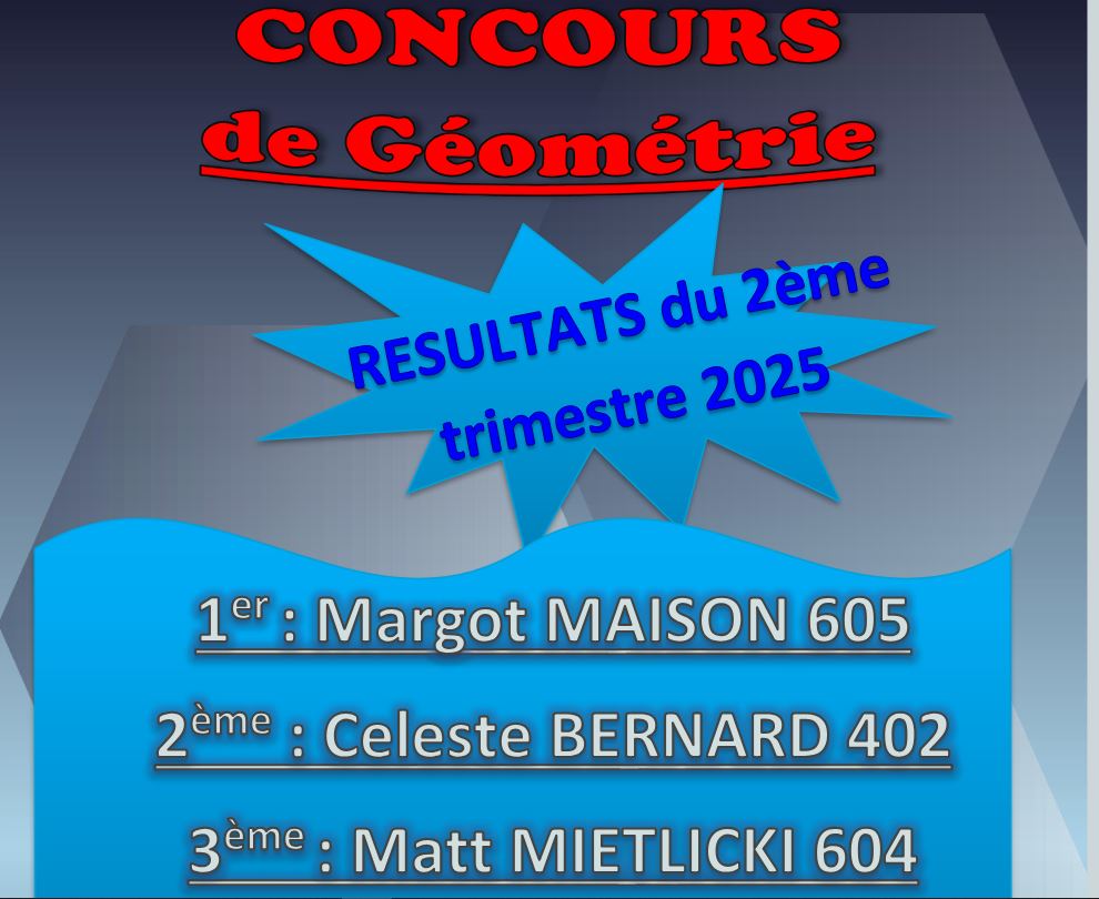 Voici en pièce jointe les résultats des gagnants du concours de géométrie du 2e trimestre.