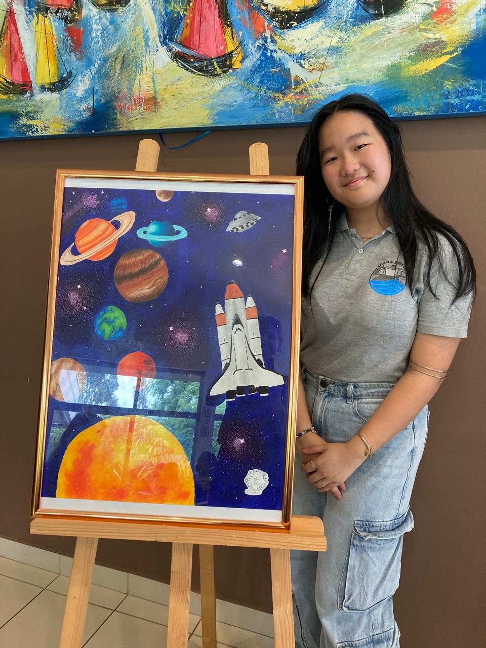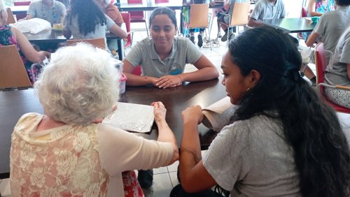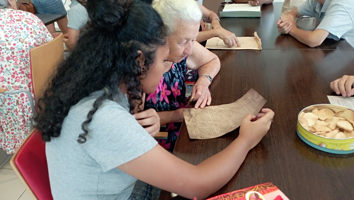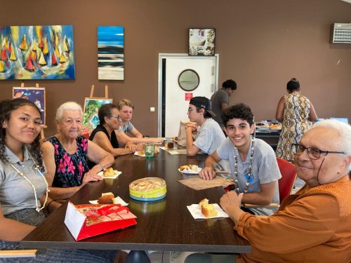 Après plusieurs mois d’échanges de lettres, de petits colis, de cadeaux, de confidences et de rires partagés, le moment était venu de se retrouver une dernière fois pour la remise officielle des biographies, ces récits de vie rédigés par les élèves à partir des souvenirs des résidents. Certains élèves ont préféré s’exprimer par la poésie ou encore par les arts visuels comme Celena qui a créé un tableau pour Alain, fan de maquettes et d’espace, et l’autre pour une résidente originaire de Polynésie.