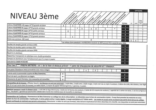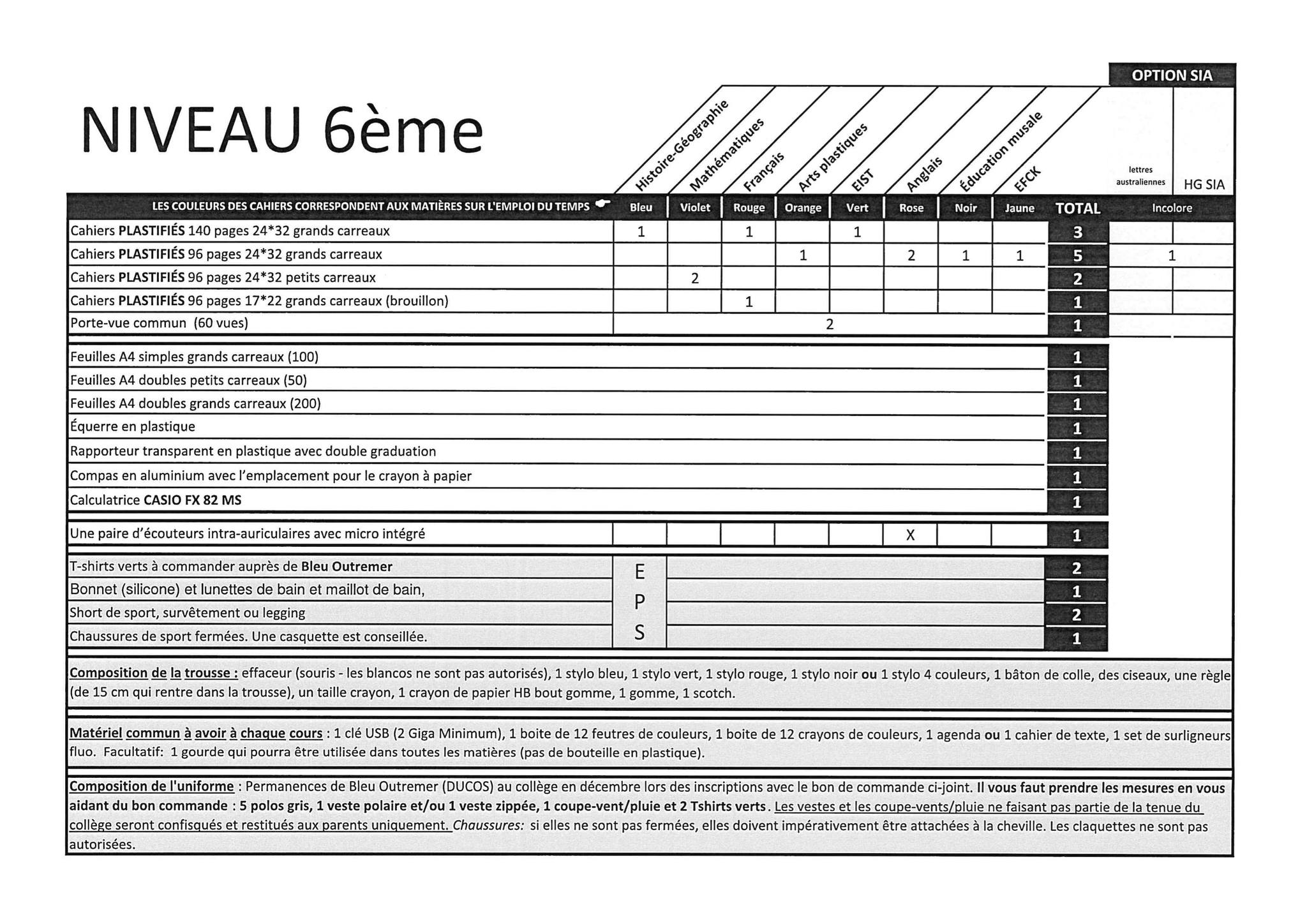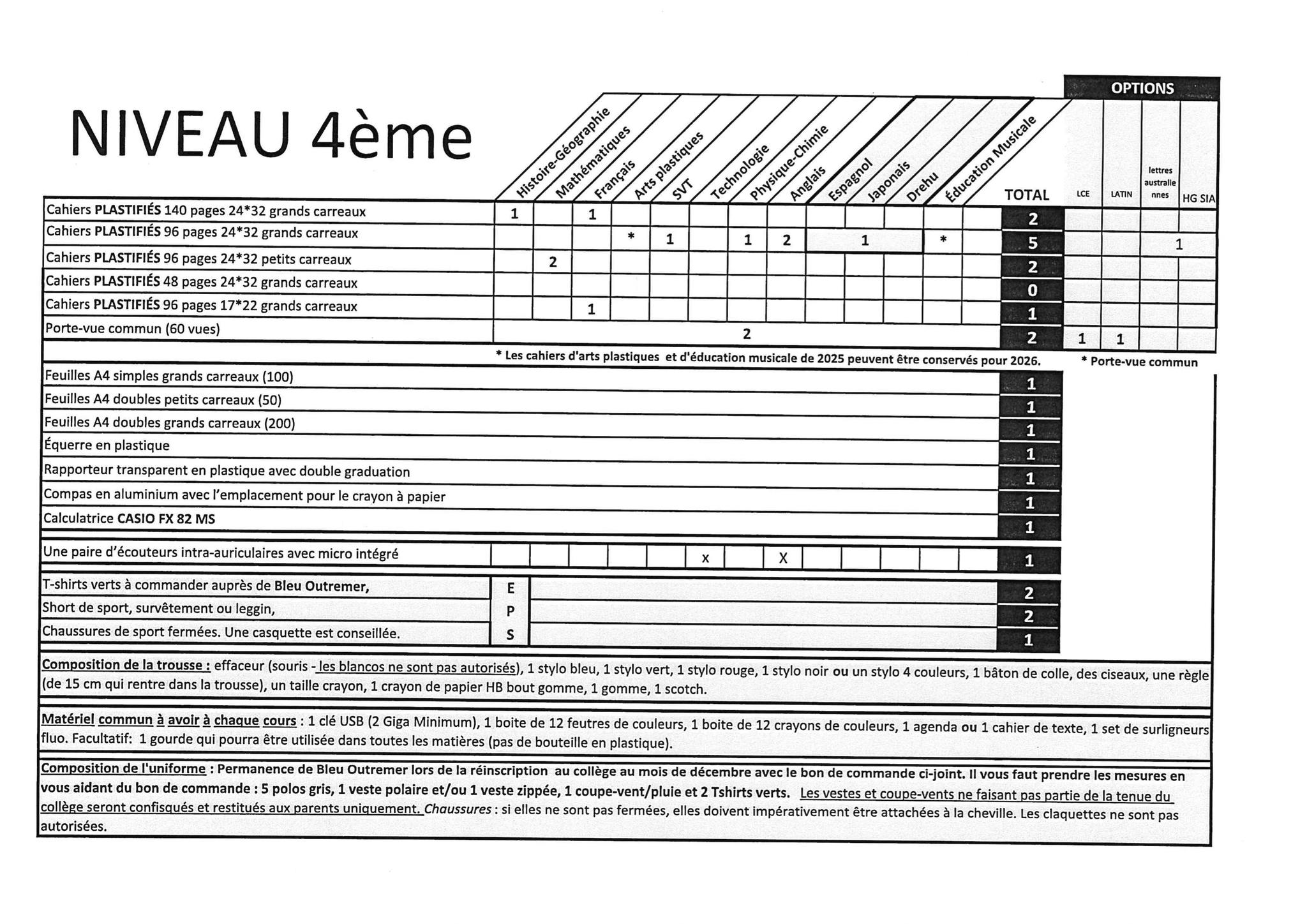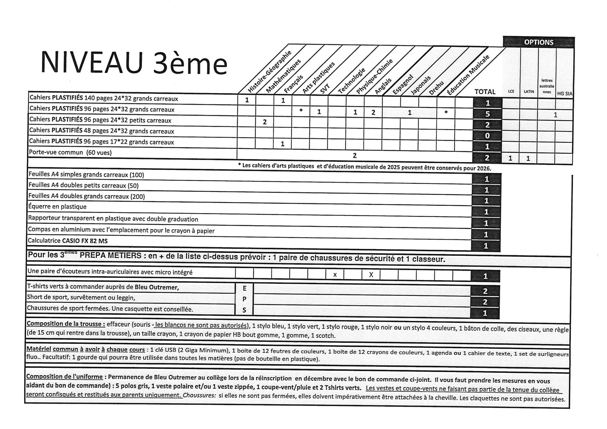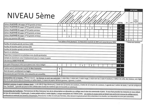 Voici la liste demandées à la rentrée 2026. Les correcteurs liquides du style "Typex" sont strictement interdits au collège ainsi que tous marqueurs.