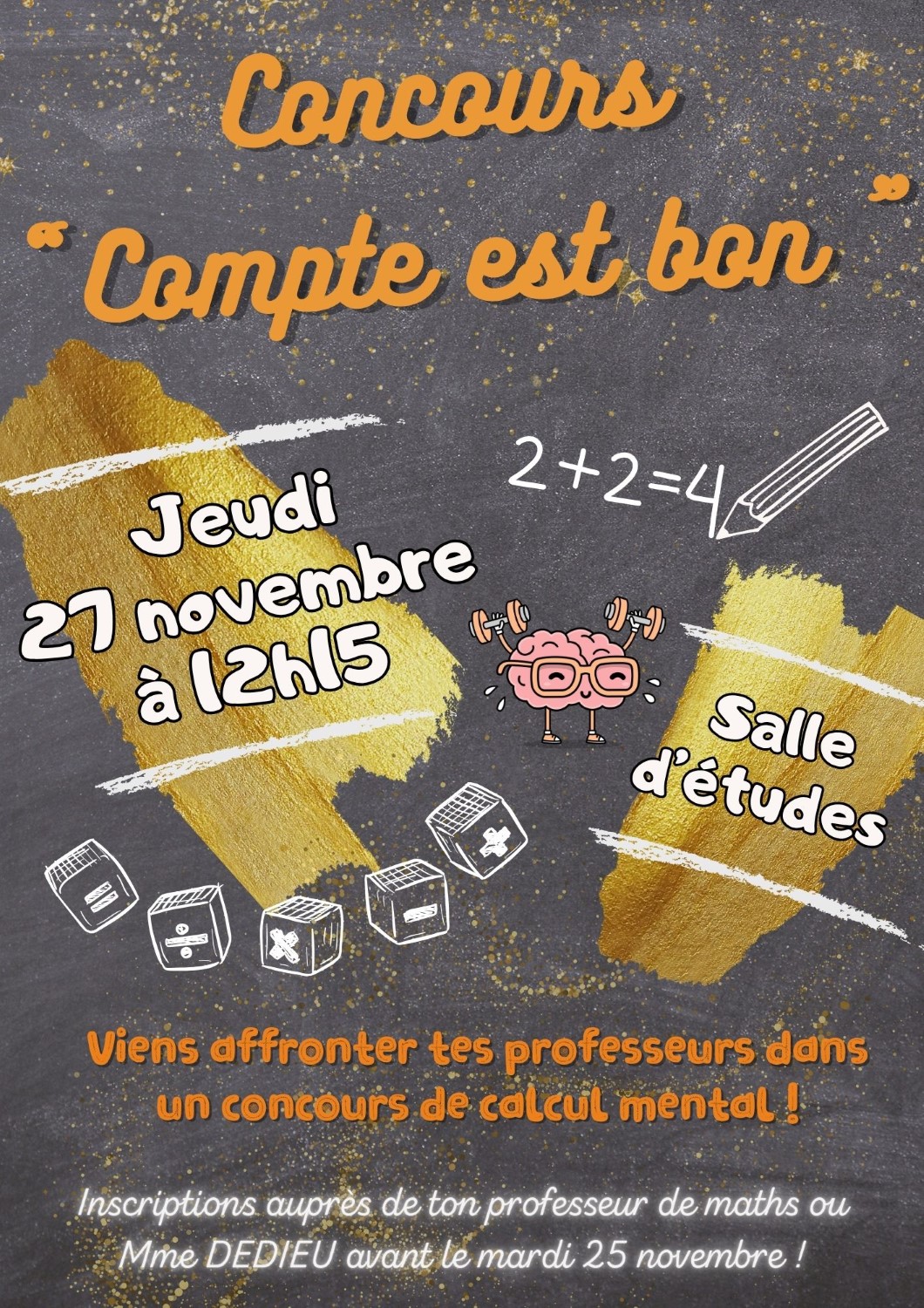 Inscris-toi auprès de ton professeur de mathématiques (ou Mme DEDIEU directement) au concours du "Le compte est bon !" avant le mardi 25 novembre !